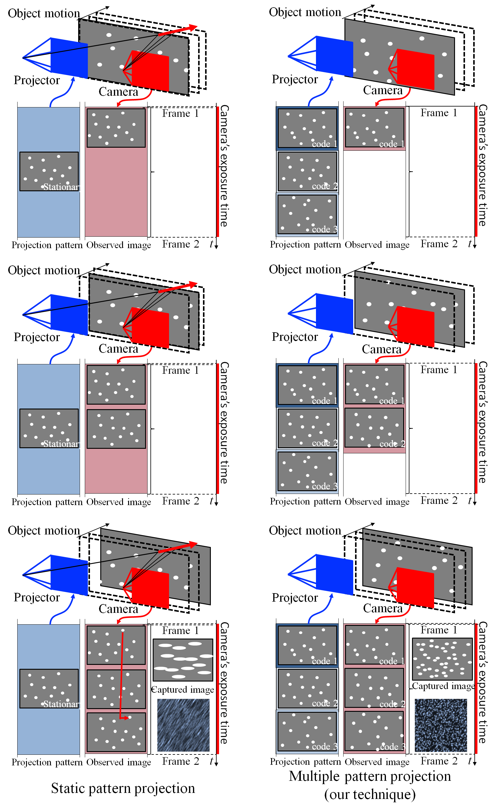1回のカメラでの撮影の間にパターンを複数回切り替えることで,モーション
