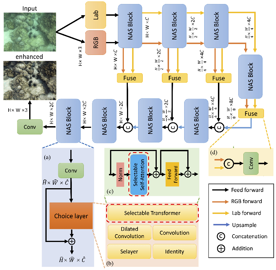AutoEnhancer: Transformer on U-Net Architecture search for Underwater Image Enhancementほとんどの深層学習ベースのアプローチは、このタスクのために異なる構造を導入し、個別のニューラルネットワークを設計して成功していますが、これらのネットワークは通常、デザイナーの知識と経験に依存して検証されます。 この論文では、Neural Architecture Search(NAS)を使用して水中画像の向上のための最適なアーキテクチャを探索し、効果的で軽量な深層ネットワークを取得できるようにします。 ニューラルネットワークの能力を向上させるために、私たちは新しい検索を提案し、畳み込みなどの一般的なオペレータに制限されるのではなく、トランスフォーマを含む検索空間を採用します。さらに、NASをトランスフォーマに適用し、選択可能なトランスフォーマ構造を提案します。 マルチヘッドのセルフアテンションモジュールはオプションのユニットと見なされ、異なるトランスフォーマ構造を導出します。 この変更は、検索空間を拡大し、ネットワークの学習能力を向上させることができます。我々のNASベースの強化ネットワークは、広く使用されているU-Netアーキテクチャを継承しており、エンコーダーとデコーダーの2つのコンポーネントで構成されています。従来のU-Netアーキテクチャとは異なり、元の残差構造や畳み込みブロックは提案されたNASブロックに置き換えられています。これにより、ネットワークは自動的に最適なオペレータを選択し、画像の向上のための堅牢で信頼性のある特徴を学習できます。以下の図は、提案されたNASベースのフレームワークを示しています。低品質の画像が与えられると、RGBおよびLabの2つのカラースペースが提案されたネットワークに入力されます。エンコーダーでは、ダウンサンプリング操作と異なる受容野を使用して、多レベルの特徴が抽出されます。その後、これらの特徴はさらにアップサンプリングされ、デコーダーで最終的な向上画像を復元するために統合されます。