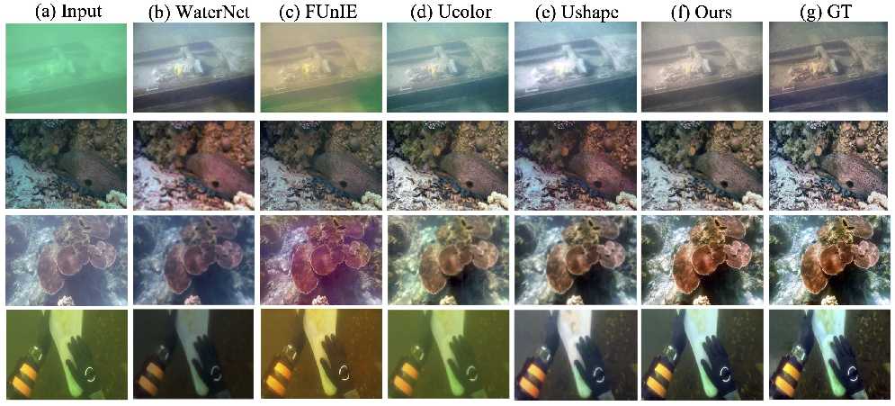 下の図は、提案された方法と水中シーンに関する最新技術との視覚的比較を示しています。船の難破(第1行)は、水中画像が色の歪み、ぼやけ、斑点模様など、さまざまなノイズに苦しむ可能性があることを示しています。以前のアプローチは、一部のノイズを除去し、原本の内容をある程度回復できますが、その向上画像には依然としていくつかの欠点が存在します。たとえば、FUnlEは主要な歪んだ色を除去しますが、左下と右下の隅には取り除けないノイズ領域が残っています。WaterNetとUshapeは元の画像の内容とテクスチャを回復できますが、画像全体の色調が変わります。彼らの向上画像と比較して、私たちの結果は画像の内容を回復するだけでなく、可能な限り色調を保持しています。