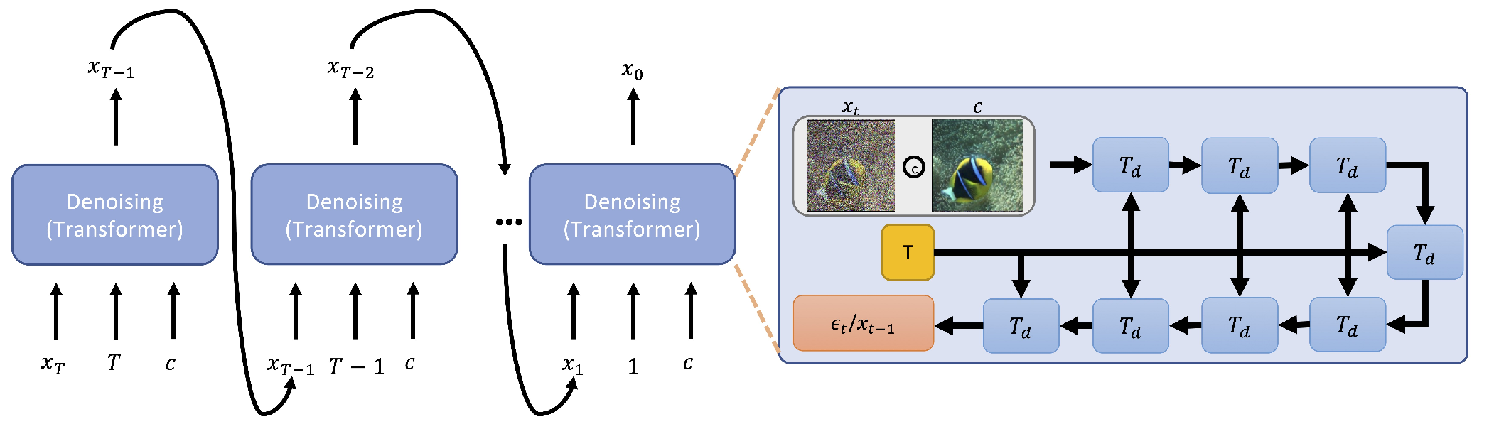 Underwater Image Enhancement by Transformer-based Diffusion Model with Non-uniform Sampling for Skip Strategyこの論文では、水中シーンでの拡散モデルを用いた画像の向上アプローチを提案しています。私たちの方法は、水中画像を入力として使用し、条件付きデノイジング拡散確率モデルを適応して、対応する向上画像を生成します。さらに、拡散モデルの逆プロセスの効率を向上させるために、2つの異なる方法を採用しています。まず、ネットワークのイテレーションごとの前進時間を効果的に促進できる軽量なトランスフォーマベースのデノイジングネットワークを提案します。一方、イテレーションの数を減らすためにスキップサンプリング戦略を導入します。さらに、スキップサンプリング戦略に基づいて、時間ステップのシーケンス用に2つの異なる非一様サンプリング方法を提案します。これらの方法はどちらも効果的で、以前の一様サンプリングに対して同じ手法を使用して性能をさらに向上させることができます。最後に、最新の最先端の手法と提案されたアプローチとの間で広く使用されている水中向上データセットの相対評価を行います。実験結果は、私たちのアプローチが競争力のある性能と高い効率の両方を実現できることを証明しています。図に示すように、私たちのフレームワークには主に拡散プロセス、トランスフォーマベースのデノイジングネットワーク、およびチャネルごとの注意モジュールが含まれています。私たちの目的は、低品質の画像を与えることで対応する向上画像を生成することです。これは、不確定な結果を持つ元の拡散モデルを使用しても満足できます。したがって、条件付き拡散モデルを導入します。入力、すなわちノイズのある画像、条件画像、および時間ステップが与えられると、ネットワークはノイジー分布を推定するために使用されます。トレーニングプロセス中、私たちはネットワークを最適化するためにL1損失を使用します。