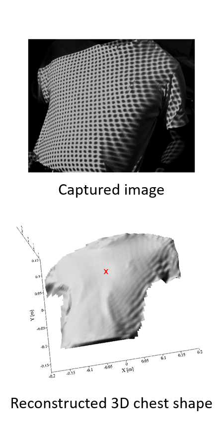 胸部表面に現れる心拍や呼吸の非接触計測は、侵襲性の低い医療モニタリングへの応用が期待される。 計測系はプロジェクターとカメラにより構成される。 胸部表面に投影されるパターン光の画像から三次元形状が復元される。