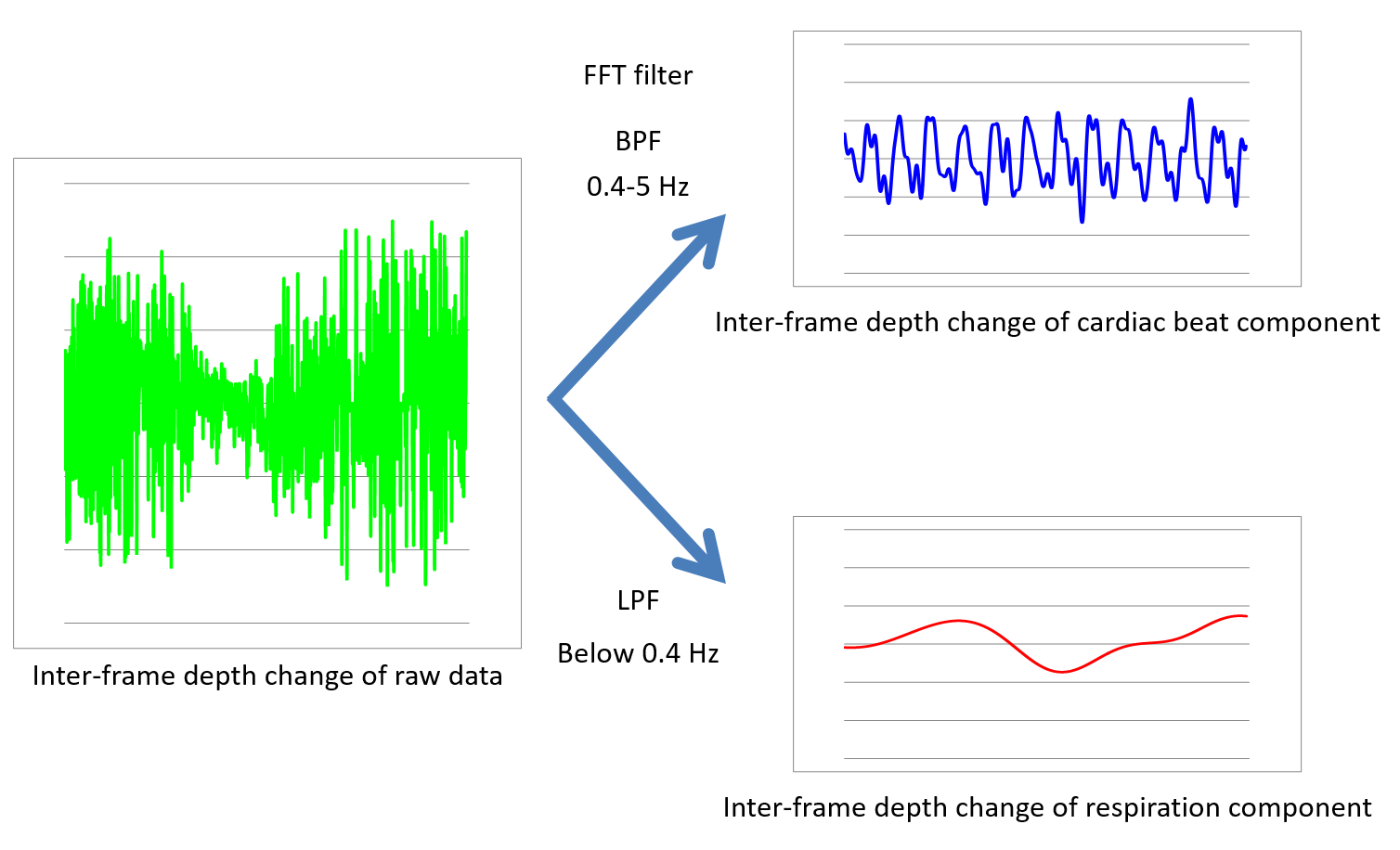 ![]() 三次元形状のわずかな変化の時系列データはノイズを含む波形であるが、シンプルな信号処理でノイズ除去が可能であり、隠された生体信号(心拍・呼吸)を抽出することができる。 ![]() 例えば、心拍による変化をカラーマップで表現することで、“目で見る聴診器”としての応用が期待される。 ![]() Publications