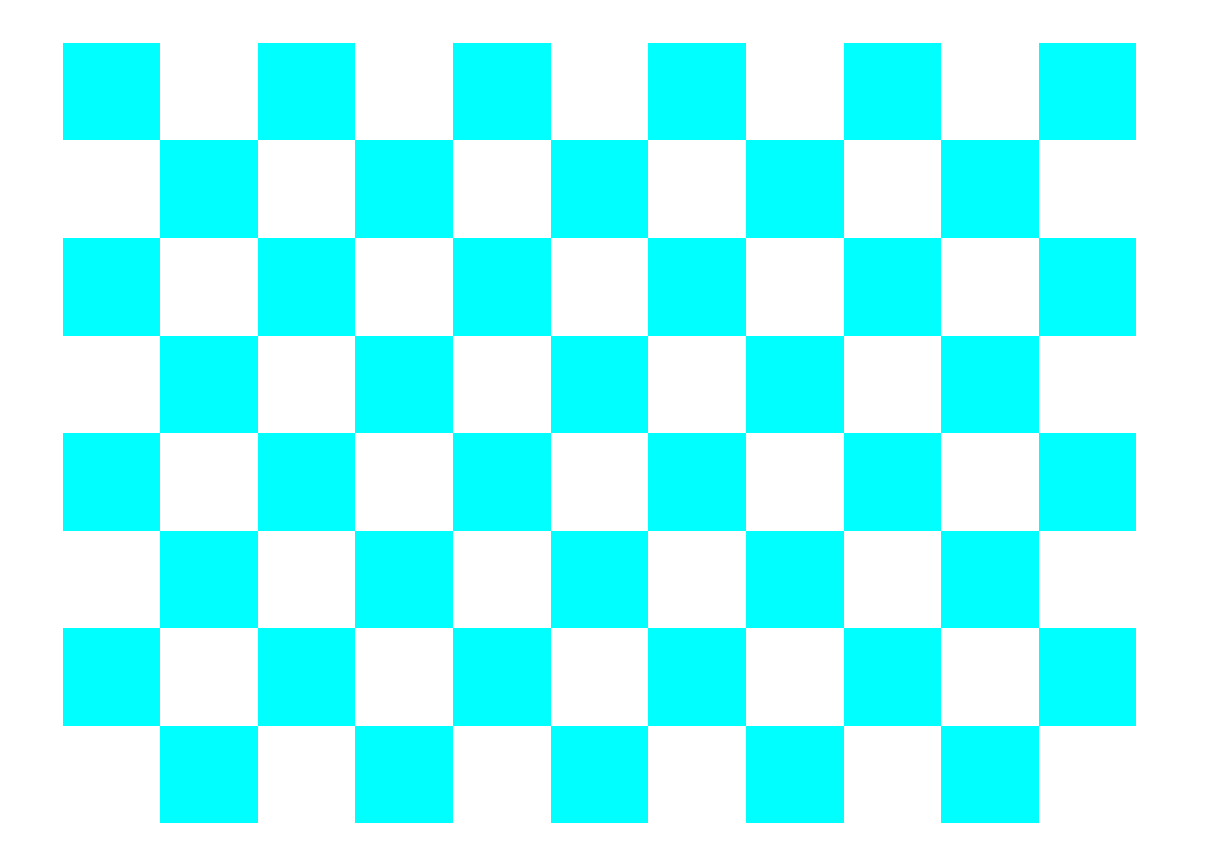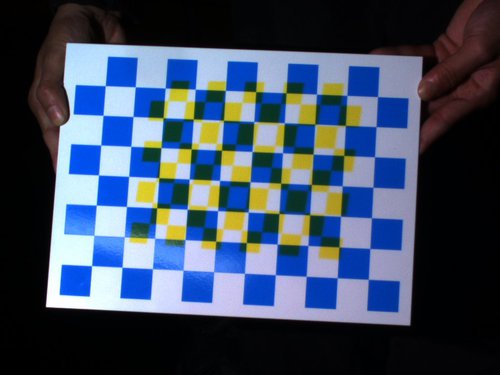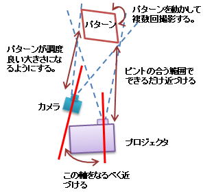 はじめに GML C++ Camera Calibration Toolboxをプロジェクタのキャリブレーションができるように改良しました。ここでは、その使い方を説明します。 計測 まず始めに計測を行います。 水色と白の市松模様を紙に印刷し、平らな板に貼り付けます。 このパターンを手に持ちプロジェクタから、 黄色と白の市松模様(うつりきらない場合は こちらの小さいパターン)を板に投影しつつ撮影することでキャリブレーションを行います。 板の角度を変えつつ複数枚の撮影を行います(高精度な結果を得るには30枚以上の計測結果があることが望ましいです。) 画像を保存する際の拡張子はbmpで保存してください。 計測に関して プロジェクタのキャリブレーションのためには、 カメラとプロジェクタの配置は下図のようにカメラはできるだけパターンに近づけて撮影し(コーナー点を検出しやすくするため)、カメラとプロジェクタの距離は短くして計測をして下さい。(内部パラメータ推定の精度を上げるため)