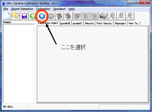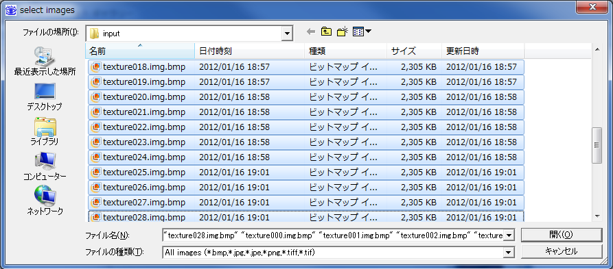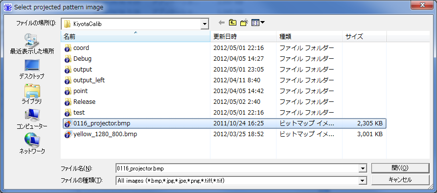 ![]() 画像の追加 次に実際にキャリブレーションのために撮影した画像を追加します。 投影パターンを選択した後に自動的に撮影画像選択に移ります。そこで撮影した画像を選択してください。 複数選択が可能であるため、撮影した全画像を選択してください。