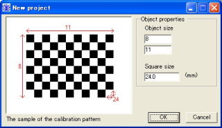 プロジェクトの作成 GML Camera Calibration.exeを起動しFile→New Projectよりプロジェクトを作成します。 (一番左の白紙アイコンを押しても作成できます。) キャリブレーションパターンの設定 このページからダウンロードしたパターンならばデフォルト値に設定されているので、そのままOK を押します。 そうでなければ、適宜パラメータを変更してください。 ![]() 投影パターンの選択 青色のプラスアイコンを選択してください。そうすると、画像を指定するためのウィンドウが開きます。そこで、撮影を行う際にプロジェクタから投影した黄色と白の市松模様を指定してください。