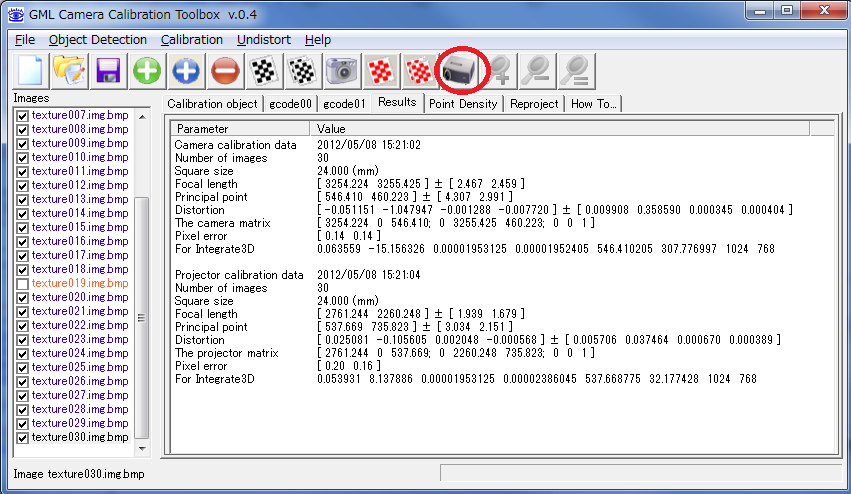 カメラとプロジェクタキャリブレーション プロジェクタアイコンを押すとResultsタブにプロジェクタパラメータが表示されます。 また、計測時に使用したカメラのキャリブレーションも可能です。 プロジェクタの投影する画像サイズは現状1024x768と決め打ちになっています。