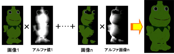 重み係数(アルファ値)を使った合成を行い、前述の陰影補正、ハイライト除去処理によって