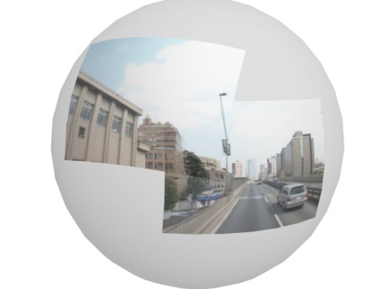 取得した画像列(映像)を時間軸方向に積層することで時空間画像を生成し、解析を行う研究も行っている。 例えば、広域空間の取得・モデリングのパノラマ画像生成では、 時空間画像の解析を利用して複数台のカメラの外部校正を行っている。 撮影した画像を共通の球面へと射影し、そこで球面時空間座標画像を生成する。