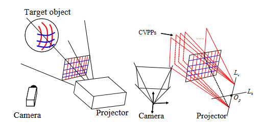 The proposed method first performs projective restoration using coplanarity, and then upgrades it to Euclidean space using pattern features (color combinations of successive grids).