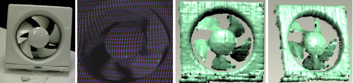 This method enables to scan 3D shape of fast-moving objects captured by a high-speed camera. In the movie below, you can see that the deforming 3D shapes can be measured as surface waves propagating over the belly of a human body hit by a ball, and the dynamic deformation of subcutaneous fat on the cheeks even when the face is just shaken. Also rotating fan was successfully captured.