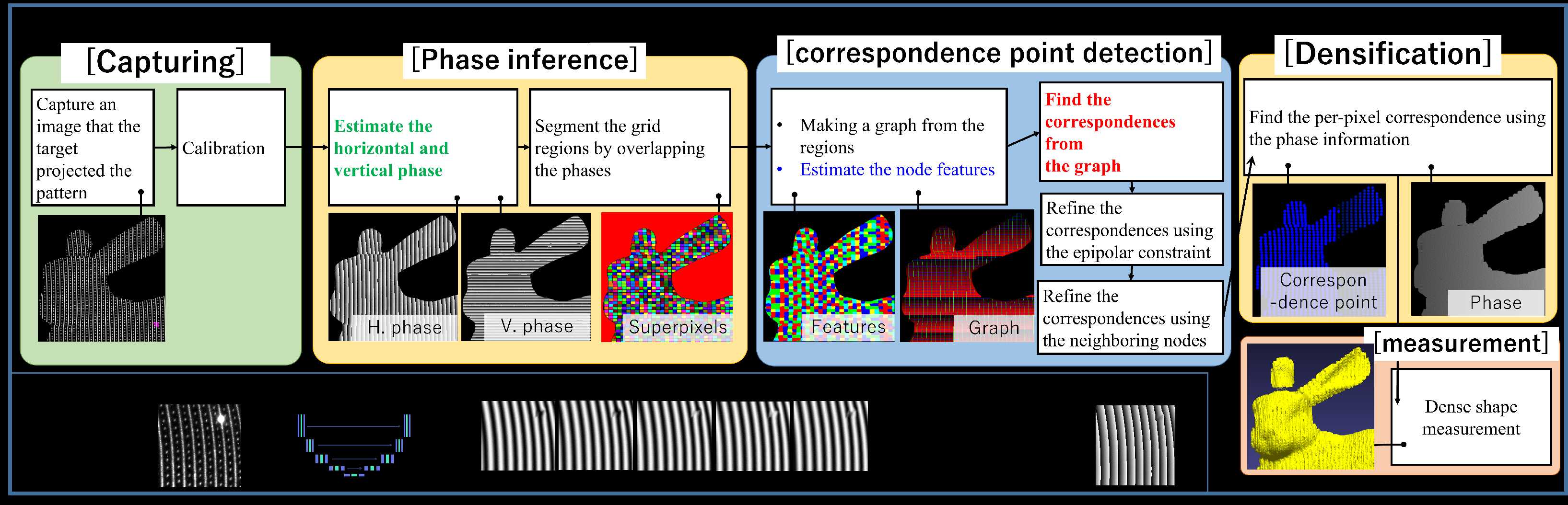 Existing methods have used three deep learning methods to achieve densification. A learning method that acquires phase information for each pixel in a repetitive projected pattern, A learning method that obtains features from images of projected patterns, The other is a learning method that uses the obtained features to infer the correspondence points with the projected pattern on a pixel-by-pixel basis. We added three more methods to these methods to achieve highly accurate shape measurement.