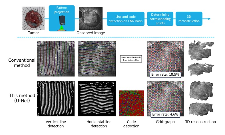 In order to demonstrate the effectiveness of the proposed method, a pattern was irradiated on a resected section of a cancer tumor in a human, the endoscope was photographed, and feature extraction was performed using learned U-Net.