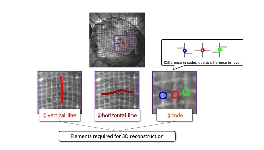 In this system, as a projection pattern of the active stereo method, a lattice pattern with a stepped difference robust to blur etc. is used,